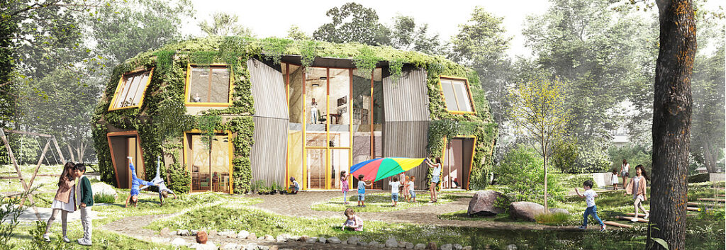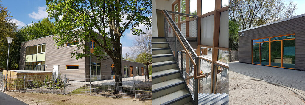 Der Neubau für 120 Kinder (drei Krippen- & vier Elementargruppen) entsteht an der Farmsener Landstraße/ Ecke Wiesenkamp in 500m Entfernung zur alten Kita. Das Gebäude ist für 3 Krippen- und 4 Elementargruppen konzipiert.
