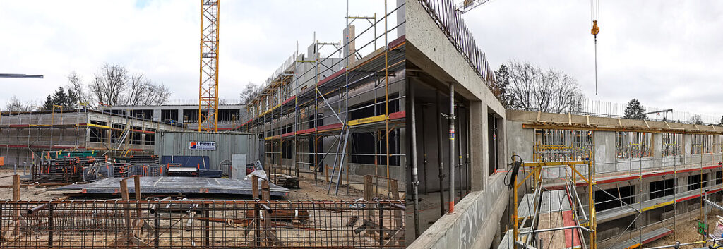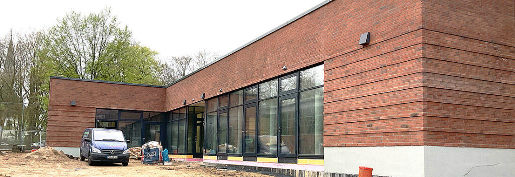 Der Neubau des Klassen- und Pausenhauses in der Archenholzstraße steht kurz vor der Fertigstellung